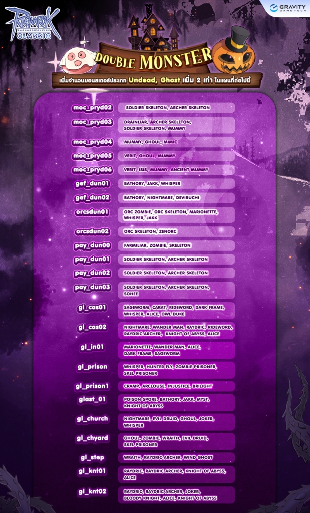รายละเอียดกิจกรรม : จะทำการเพิ่มมอนเตอร์ผีตามแมพที่กำหนดไว้ในช่วงระยะเวลากิจกรรม
