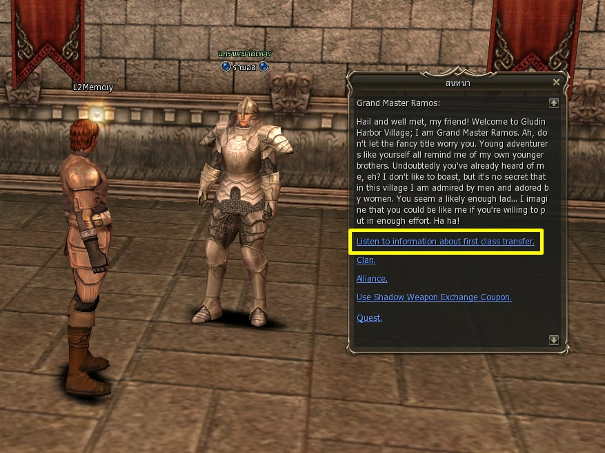 8. คุยกับ NPC แกรนด์มาสเตอร์ รามอส ที่อยู่ในสมาคมนักรบ หมู่บ้านปราสาทกลูดิน เลือกหัวข้อแรก