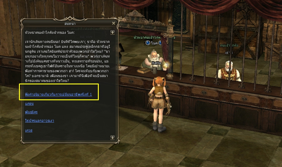 9. คุยกับ NPC หัวหน้าคนเฝ้าโกดังฝากของ โมค ที่โกดัง ของหมู่บ้านปราสาทกลูดิน คุยและเลือกหัวข้อแรก